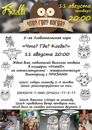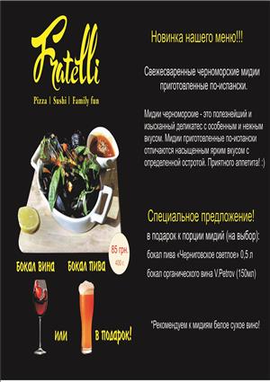 Пиццерия "Фрателли"...это семейный ресторан, в котором каждый может найти что то для себя.Детки найдут уголок для развлечений, очень вкусную пиццу, и домашние лимонады.Их родители в это время смогут насладиться свежими и очень вкусными ролами, пастами и дарами моря. Мы проводим концерты и вечера музыки.По четвергам у нас проходят любительские игры "Что?Где?Когда?"